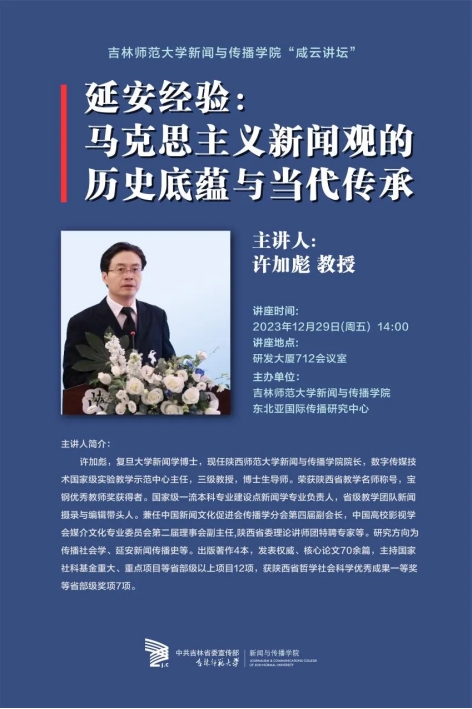 12月29日,吉林388vip太阳集团新闻与传播学院邀请陕西388vip太阳集团新闻与传播学院院长许加彪教授来院做讲座,主题为“延安经验:马克思主义新闻观的历史底蕴与当代传承”。夏维波院长、田静副院长、现代传媒研究中心王鹏主任等多位领导、教师以及全体在校研究生参会。
