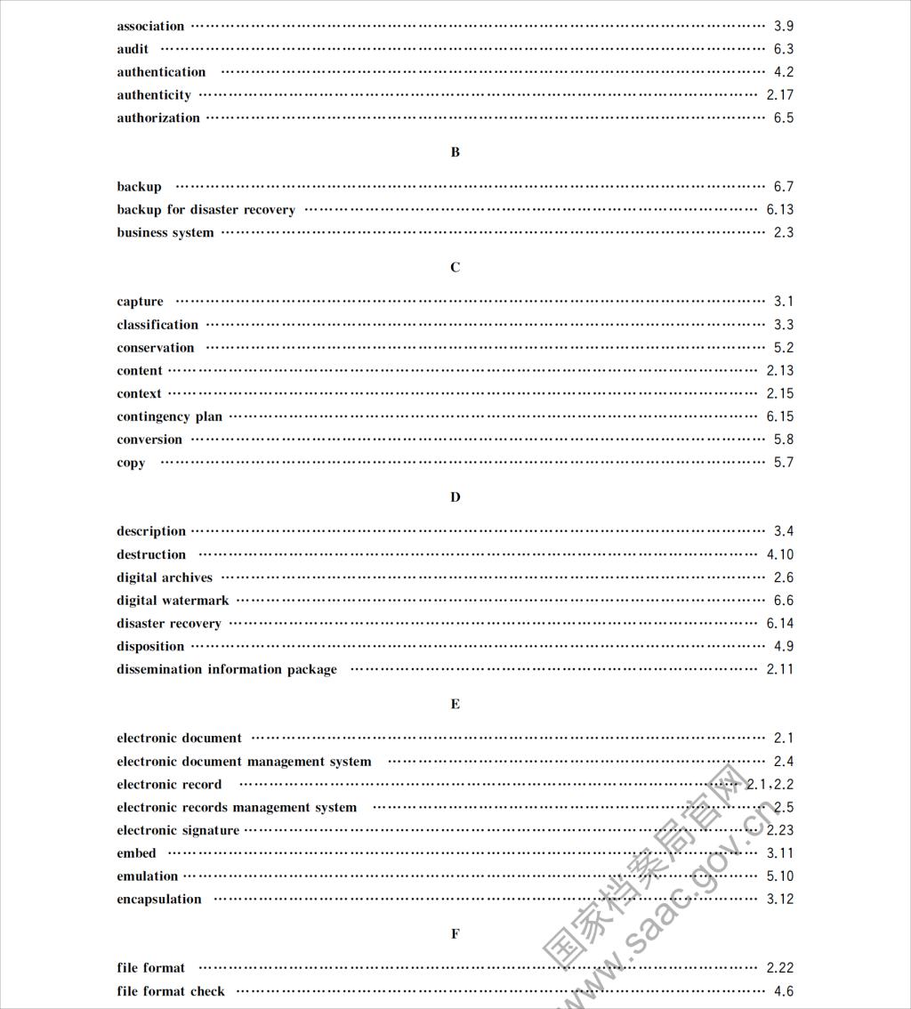 本标准的条目按电子档案的管理流程编排。每个条目均由条目编号、汉语术语、英语对应词和定义等部分组成。优先术语采用黑体,定义或注释内出现的在标准其他处定义过的优先术语也采用黑体,且其后跟随相应的条目编号(加圆括号),定义中的注释或补充说明亦加圆括号“()