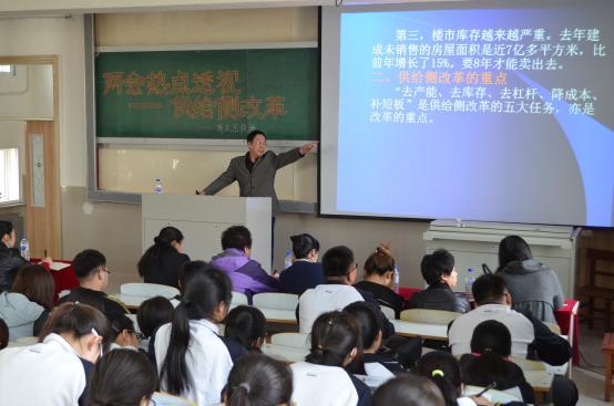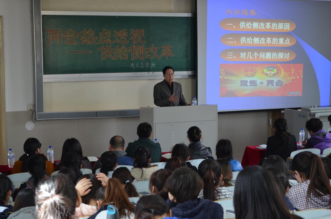 周亚东教授在报告中从供给侧结构性改革的原因、内容、表现和供给侧改革的重点等方面,为我们解读了供给性改革的结构性内涵。周教授强调了供给侧改革的目的在于增强经济持续动力,推动我国社会生产力水平整体跃升,详尽解读了以“去产能,去库存,去杠杆,降成本,补短板”为重点的供给侧结构性改革,并对供给侧结构性改革是否会导致下岗潮,是否照搬供给主义等现实问题提出思考和探讨。报告生动详实、贴近生活、贴近实际和实事热点,使全体师生耳目一新、受益匪浅。