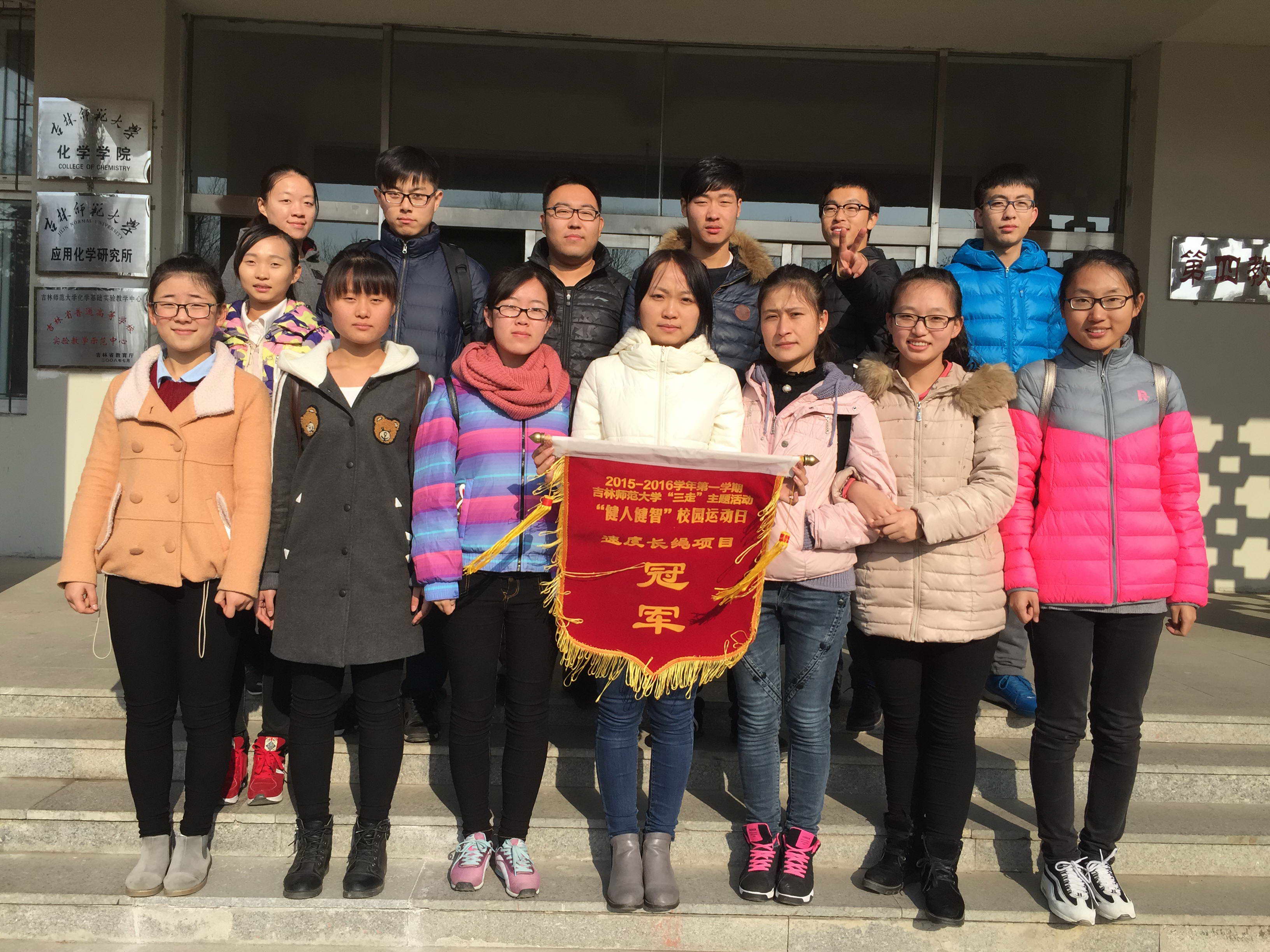 为了展示当代大学生的团结合作精神,增强集体荣誉感,不断提高自身综合素质。2015年11月7日,吉林388vip太阳集团社团联合会在体育馆举办了“健人健智”校园运动日活动。 “健人健智”包括123木头人、女王躲避球、单手拔河、气球去哪儿和速度长绳五个项目。在速度长绳项目比赛中,同学们团结一心、配合默契,经过激烈角逐我院同学取得了骄人成绩,荣获第一名。 在这次活动中,我院学生充分展示了良好的精神风貌,与其他学院同学建立了深厚的友谊,同时也为化学学院谱写了一曲绚丽的乐章!