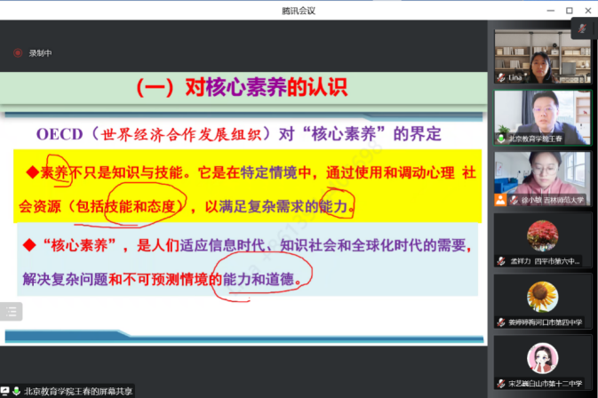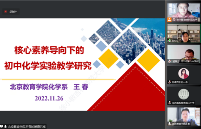 2022年11月26日,吉林388vip太阳集团化学学院邀请来自北京教育学院的王春副教授,以腾讯会议直播的形式,为我院2021级、2022级专业硕士研究生做题为《核心素养导向下的初中化学实验教学研究》的专题培训,此次培训内容精彩,从对学科核心素养的认识角度向学生们展示了王春老师的教学研究思想。