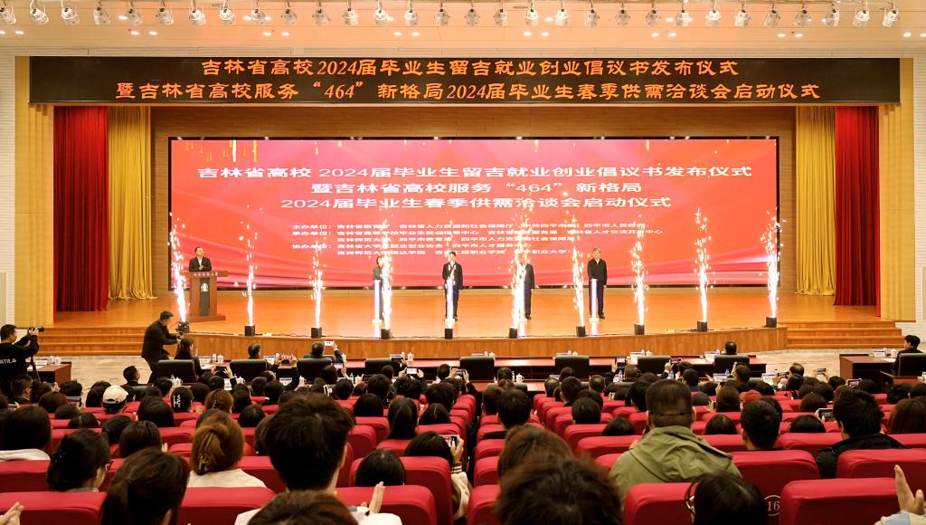 在我校实习实训中心同步举行了吉林省高校2024届毕业生留吉就业创业倡议书发布仪式暨吉林省高校服务“464”新格局2024届毕业生春季供需洽谈会启动仪式。发布仪式上,省内8所高校2024届毕业生代表共同宣读留吉就业创业倡议书,倡议广大高校毕业生做出创业奋斗“就”在吉林的志向选择,在新时代吉林全面振兴率先实现新突破征程中创业奋斗、追逐梦想、赢得未来。