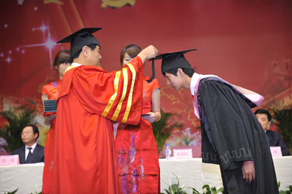 张伯军为2011届获学士学位和硕士学位的毕业生代表颁发证书,并进行学位授予仪式。