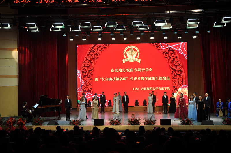 汇报演出中,由“长白山技能名师”付庆义老师导演并主演的二人转《枫叶红了》、拉场戏《孪生姐妹》亮相吉师音乐厅,鲜明的主题、感人的故事和精彩的表演,充分展现了新时代大学生的精神风貌。两部剧2017年作为优秀剧目入选中国曲艺家协会举办的首届东北地方戏曲优秀曲艺节目展演并获展演奖,又参加吉林省第八届二人转、戏剧小品艺术节演出。二人转《枫叶红了》2018年参加第十届中国曲艺牡丹奖评选,主演付庆义老师荣获“牡丹奖”提名奖。演出中我院2016级学生用美声唱法演唱的二人转《小看戏》赢得了阵阵掌声,由学生张嘉怡、吴峥等表演的二人转小帽联唱《正反对花》也得到了同学们频频喝彩。汇报演出初步展示了我院东北地方戏曲教育教学的可喜成果和为传承、发展、创新、弘扬东北这一传统文化品牌所做出的应有努力。