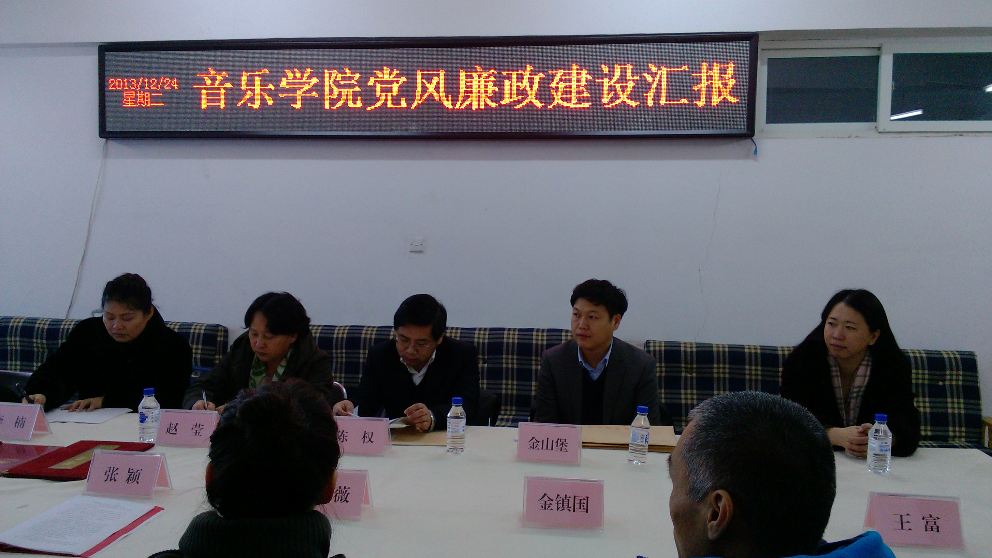 2013年12月24日上午,以东北388vip太阳集团纪委赵莹书记为组长,长春大学纪委陈权书记为副组长的检查组一行四人来我院检查党风廉政建设工作。校纪委王亮书记、王忠义副书记、曹鲲鹏副处长等陪同检查。检查组首先听取了院党总支张颖书记从六个方面做的工作汇报,校纪委王亮书记对近年来音乐学院的党风廉政建设工作给与了充分肯定。检查组组长赵莹书记做了重要讲话,她对我院党风廉政建设工作,尤其是“廉政文化进校园”工作取得的成绩给予了高度评价。最后,检查组与学院领导班子成员进行了广泛深入的交流。