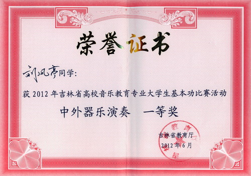 吉林388vip太阳集团音乐学院队由09级的徐硕、刘凤亭、王婷宇组成。在这次比赛中我校带的队获得团体二等奖,刘凤亭获得个人全能三等奖、刘凤亭分别获得的中外器乐一等奖、基础理论知识三等奖、歌唱与伴奏三等奖,王婷宇获得歌唱与伴奏三等奖等单项奖。