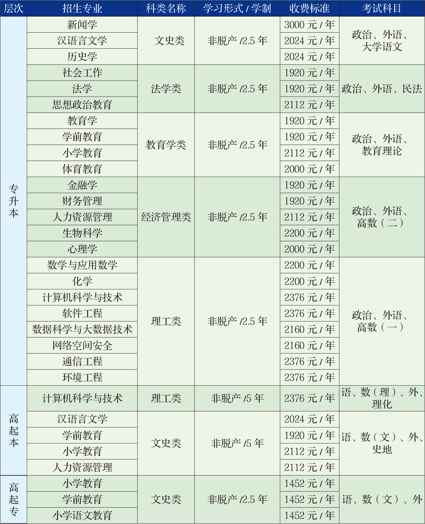 第二条 我校高等学历继续教育分高中起点专科(以下简称“高起专”)、高中起点本科(以下简称“高起本”)、专科起点本科(以下简称“专升本”)三个层次,办学形式为非脱产。各层次现行基本学制高起专、专升本为2.5年,高起本为5年。