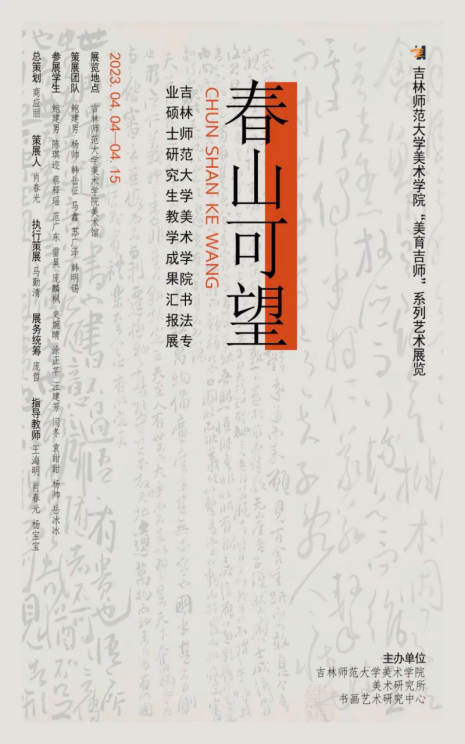 2023年4月15日,由吉林388vip太阳集团美术学院、美术研究所、书画艺术研究中心主办的“春山可望——吉林388vip太阳集团美术学院书法专业硕士研究生教学成果汇报展”圆满闭幕。美术学院党委书记刘兴亚、院长陈思、三位书法专业导师、 学院部分师生共同参加开幕式,开幕式由副院长商应丽主持。