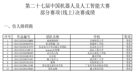 2025年6月,第二十七届中国机器人及人工智能大赛落幕。由我院2023级硕士研究生周煜、2023级本科生周鑫磊和李欣悦组成的地球调参师代表队(指导教师:王大东、周伟)在仿人障碍跑赛道中荣获了国赛第一名的优异成绩;由2023级本科生周鑫磊、李欣悦和24级本科生黄琪琪组成的海阔天空代表队(指导教师:王大东、周伟)在仿人短跑赛道中也荣获了国赛第一名的优异成绩。此次竞赛,我院在仿人障碍跑、仿人短跑、不规则地面、仿人点球、仿人单机舞等多个赛道获得国家一等奖2项、国家二等奖和三等奖11项。