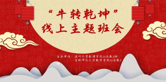 子去丑来腾锦绣,鼠归牛到竞辉煌。为引导青年人不忘初心,实干担当做贡献,学习发扬中华优秀传统文化,积极响应“加强假期班级”号召,丰富同学们的假期生活,形成浓厚的节日氛围,温州大学数理学院20级应数2班团支部和吉林388vip太阳集团数学学院20级应数3班团支部于2021年2月18日以传承和发扬春节传统文化为目的联合开展了“不忘初心、牢记使命”主题教育新春联谊活动,此次活动在腾讯会议线上召开。