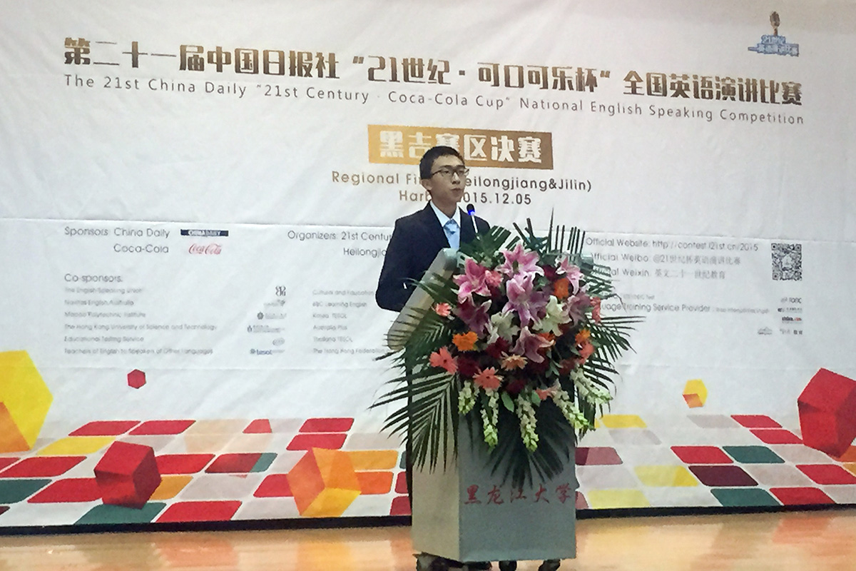2015年12月5日,在黑龙江大学举办的第二十一届中国日报社“21世纪?可口可乐杯”全国英语演讲比赛黑吉赛区决赛中,我院商务英语专业2015级郭俊铭同学获得决赛三等奖的好成绩。第二十一届中国日报社“21世纪?可口可乐杯”全国英语演讲比赛黑吉赛区决赛共有30名来自黑龙江省、吉林省各高校的选手代表本校参加决赛。在胡晓丽老师和潘雁老师的指导下,我院2015级郭俊铭同学进入最后决赛,获得三等奖,彰显了吉林388vip太阳集团外国语学院商务英语专业学生过硬的专业技能!