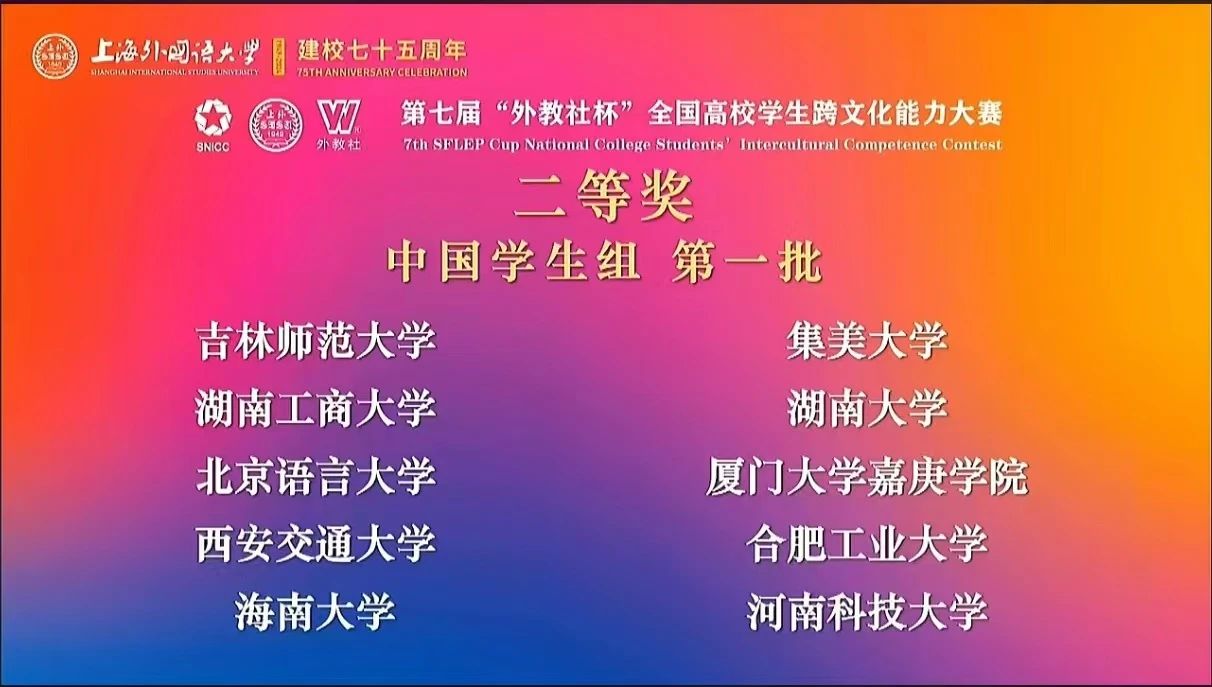 12月1日,第七届“外教社杯”全国高校学生跨文化能力大赛全国决赛总决赛在上海外国语大学圆满落幕。我校代表队李宇豪(2023级英语笔译)、侯佳希(2022级物理专业)、高宇婷(2023级化学专业)在刘冬霞副教授、胡晓丽副教授的指导下,与来自全国各个地区的64支高校代表队同台竞技,最终获得了二等奖第一名的成绩,刷新了吉林省在该项赛事中的历史最佳战绩。