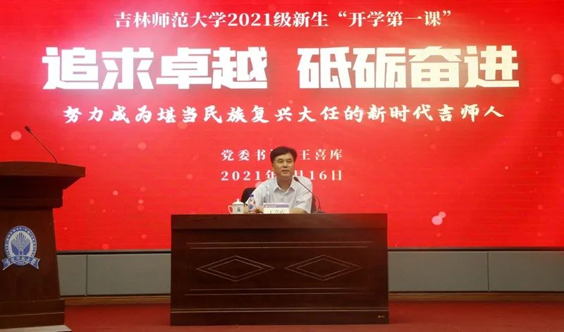 9月16日,校党委书记王喜库以《追求卓越 砥砺奋进 努力成为堪当民族复兴大任的新时代吉师人》为题为2021级新生讲授“开学第一课”暨思政课首讲。授课采取线上和线下相结合的方式进行,相关部门负责人、全体2021级新生4000余人聆听报告。