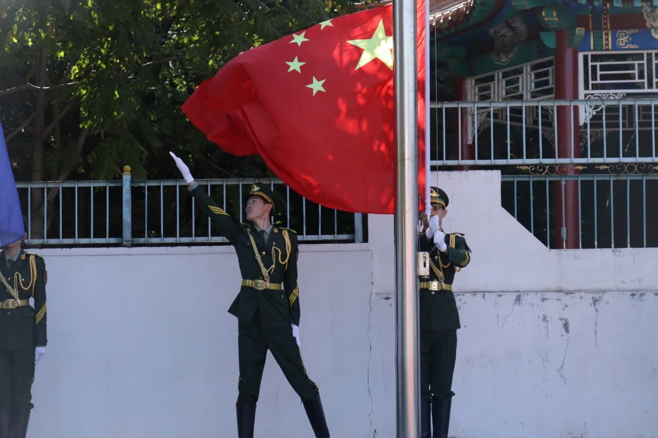 升旗礼毕,梅丽娜宣布军训分列式正式开始。军训总教官张松指挥各方阵依次通过主席台。同学们步伐铿锵、口号响亮,展现出严明的纪律与饱满的斗志;紧随其后的擒敌拳表演动作刚劲、气势如虹,全面展示了2025级新生的军训成果与青春风采。