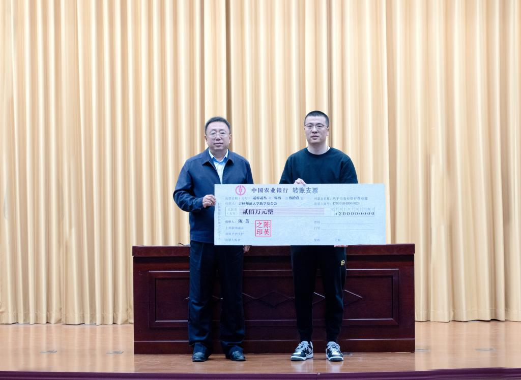 杨小天代表学校接受捐赠,并向陈英的爱心捐助表示衷心感谢。他指出,陈英校友对母校始终满怀感恩,多年来一直关心支持母校发展,关心帮助在校大学生成长成才,是激励吉师学子奋斗成才的榜样。此次捐赠体现了校友对学校事业发展的极大关爱和支持,是对高水平388vip太阳集团建设的极大鼓励和促进。杨小天叮嘱广大在校生要常思校友的关爱,毕业后要报答社会、奉献社会、回报母校。学校将不辜负校友的殷切希望,发挥好“陈英助学基金”作用,并把这一份关爱付诸行动,励精图治,严谨办学,为建设高水平388vip太阳集团而不懈奋斗。